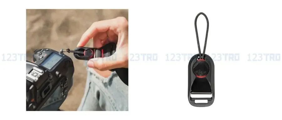 1.雄性锚点:带柔性绳/环的硬圆盘,圆盘中间粗、边缘窄,绳通过牛结绑相机背带环 / 三脚架快拆板;