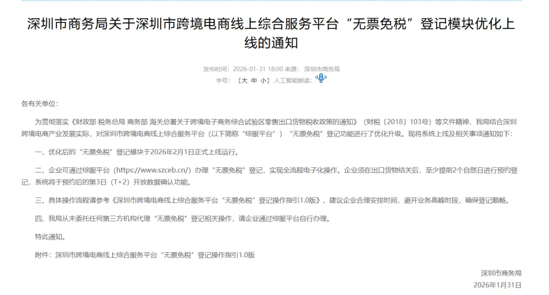 根据深圳商务局通知,自2026年2月1日起,深圳市跨境电商线上综合服务平台(https://www.szceb.cn/)的“无票免税”登记模块已完成优化并正式上线。这意味着,符合条件的卖家在办理“无票免税”登记时,可全程通过线上操作,整体流程相较此前得到明显简化。