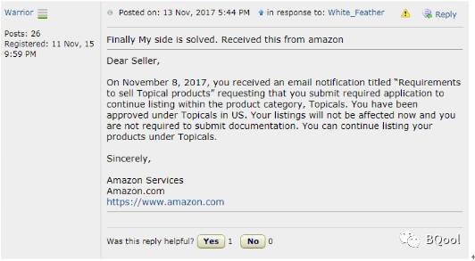 有一个国外的卖家都是贩售 Beauty and Health 类目的商品,也就是 Topical 类目。他就是接收到电邮通知发帖的卖家,但过几天随即收到亚马逊的电邮表示他已经通过审核,可以继续上架和贩售 Topical 类目 的商品。