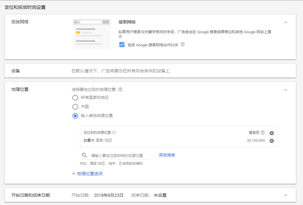 投放地区就是你的客户定位,投放时间和具体预算都是你自己设置的,Google Shopping本身就属于搜索网络的一种广告形式;投放设备在创建campaign时也默认支持所有类型,在创建好之后可以修改。