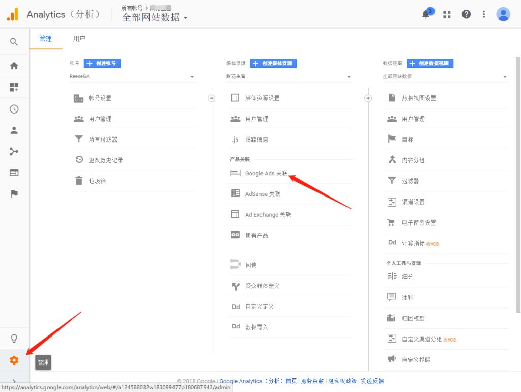 2.进入首页后点击左下角“管理”-“帐号关联”-“Google Ads”