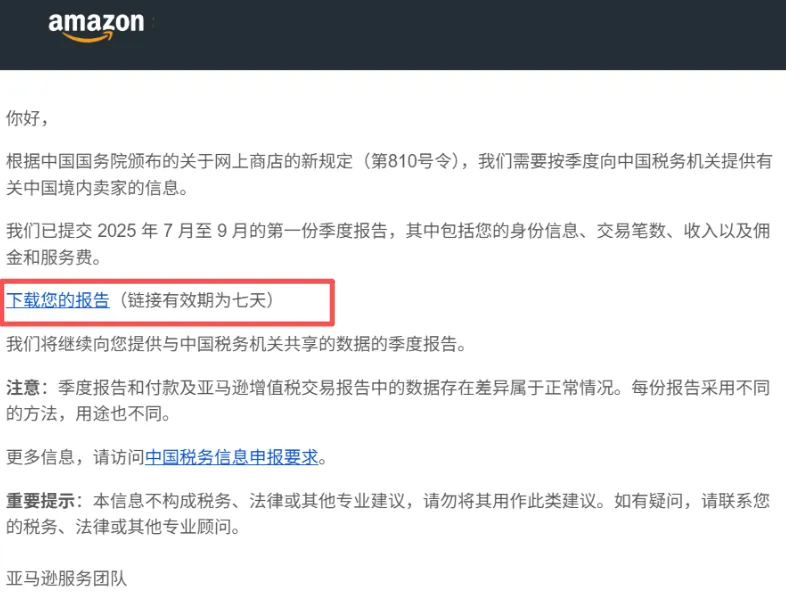 根据该邮件内容显示,亚马逊已根据中国国务院颁布的第810号令,向税局提交了中国境内卖家的2025年7月至9月的第一份季度报告;