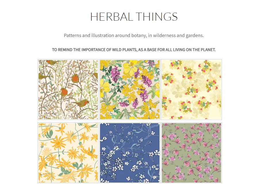Herbal Things 是由艺术家 Sabina Kulicka 创立的视觉设计品牌,作品灵感来自植物、花园和大自然风貌。她将这些原创植物纹理、插画和图案广泛应用于家居装饰、印花面料、手工包袋等产品上,部分作品通过 Etsy、Society6、Spoonflower 等平台授权生产和销售。