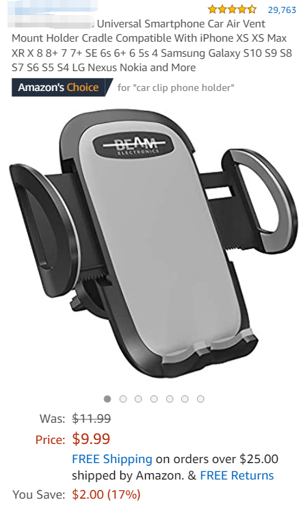 目前亚马逊车用手机支架类目Cell Phone Automobile Cradles的Best Seller是一款运营了3年的产品,累积评价近3万,评分4.3星,价格$9.99,性价比非常高。这种级别的产品,基本是处于躺赚状态了,一般新手很难挑战。