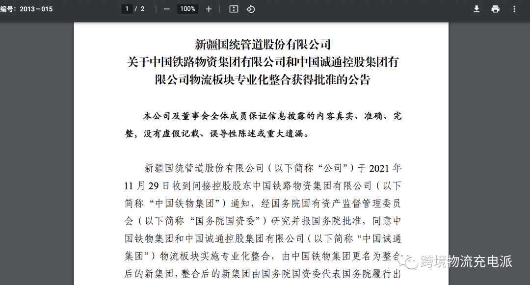 注:以上截图来源于公开文件《新疆国统管道股份有限公司关于中国铁路物资集团有限公司和中国诚通控股集团有限公司物流板块专业化整合获得批准的公告》。