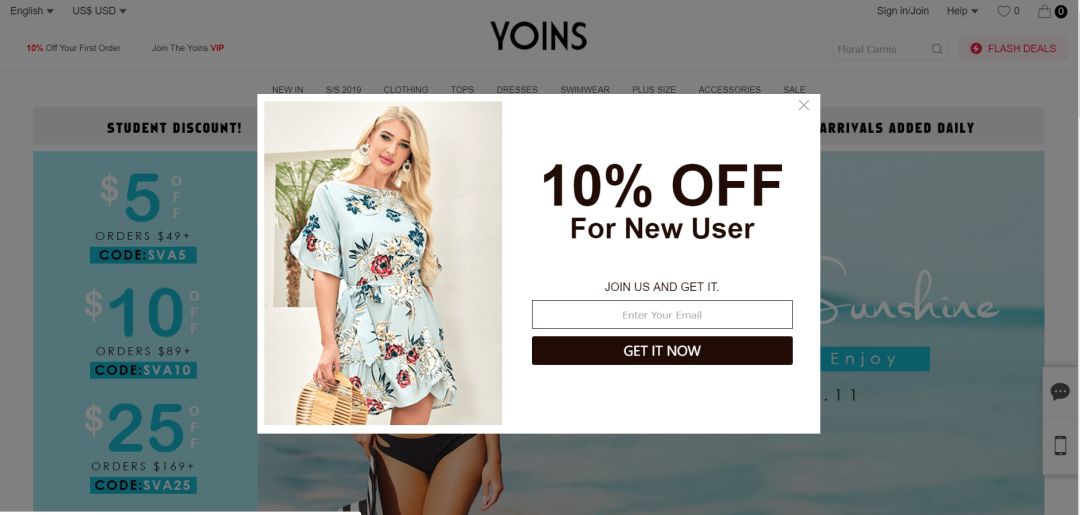 Yoins网站在它的限时抢购页面上同时展示了稀缺性和紧迫性。预告何时会结束的倒计时计时器为销售创造出一种紧迫感。在每个产品下面,它列出该产品售出部分的百分比。由于库存有限,已经售出90%及以上的商品可能会促使顾客立刻购买。