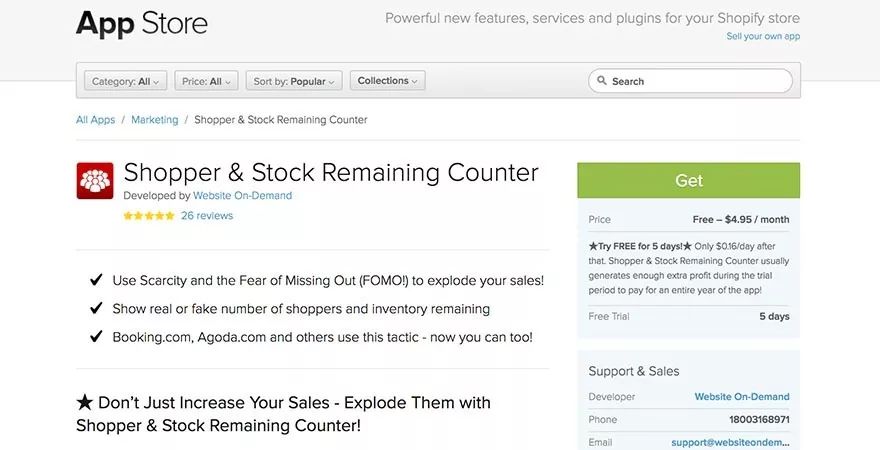 Website on Demand(https://apps.shopify.com/pressure-cooker)是一种制造“稀缺性”的工具,它能让客户体验到一种害怕错过的感觉。这有助于他们采取行动,客户将能够看到有多少人目前正在查看该产品,以及有多少单位的现有库存。如果您正在向特定页面引入大量流量,那么当客户看到有多少人在查看同一产品时,就会有助于制造紧迫感。