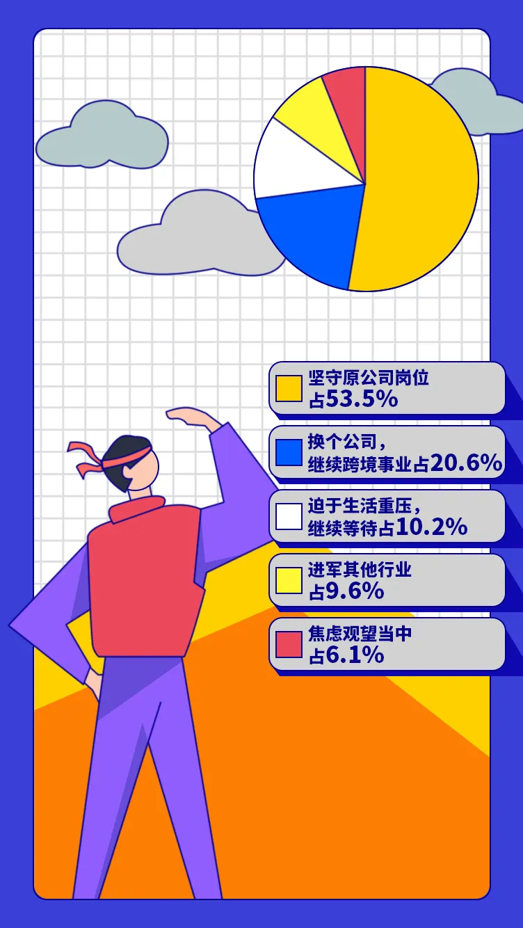 01 / 计划赶不上变化的2020 2020年,疫情对哪个行业受到冲击最大,最惨? 跨境电商表示:我们说第一,没人敢说第二。 横批:跨境寒冬期 上联:物业催租金,员工等工资,难平缺口。 下联:工厂缺人手,运输减班次,祸不单行。 2020年,有些人光活着,就已经很艰难了。 疫情前,忙碌但充实地加班VS疫情后 悠闲但焦虑的底薪,你PICK哪个? 04 /着手布局,打个漂亮翻身仗 国内刚打完上半场, 国外继续打下半场,跨境人看全场。 上半年基本大局已定, 那么,卖家们该如何调整营销策略应对当下? 05 / 跨境人何去何从? 其实,虽然说2020年第一季度对于跨境人来讲,是前所未有的磨难,但仍有超过八成的跨境人对跨境行业选择不离不弃,依旧对跨境行业抱有热忱的期望,选择坚守岗位。 不可否认,2020年的开头很难,尤其是对我们跨境人而言。但只要我们不忘初心,终能驱散疫情带来的阴霾,迎来胜利的曙光,开启新的篇章。风险与机遇并存的时代,熬过去了,说不定你就是下一匹黑马。 在此感谢每一位继续在跨境圈默默奋斗的老铁们,道阻且长,万里汇与君共勉,加油干。