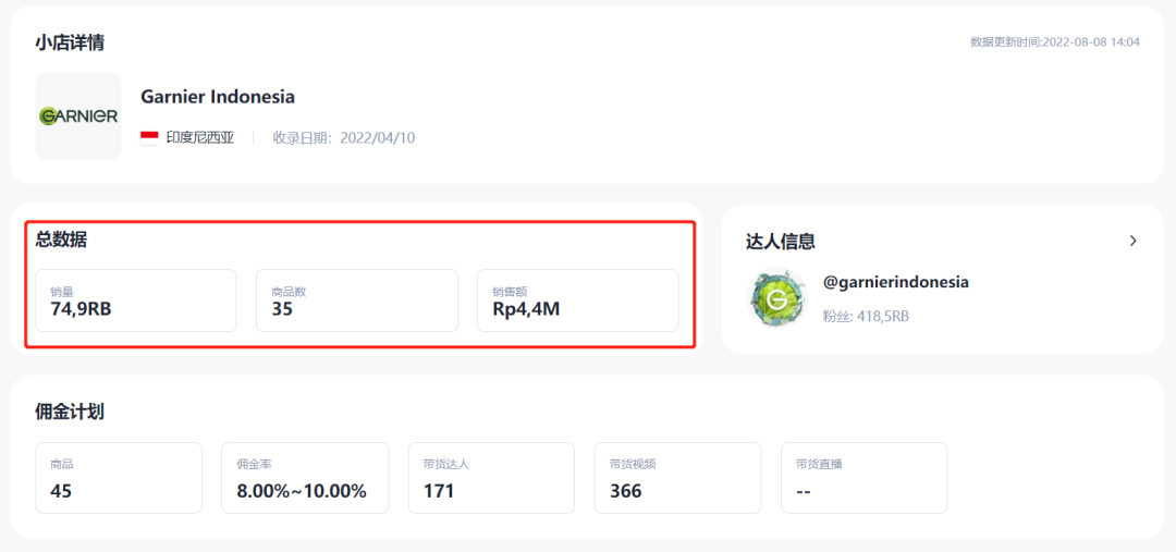 根据嘀嗒狗数据显示,卡尼尔入驻小店之后,销量为74,9RB,销售额约为Rp4,4M(M:十亿),仅七月份销量就有38,7RB,销售额达到了1,8M(约等于81.9万人民币)。