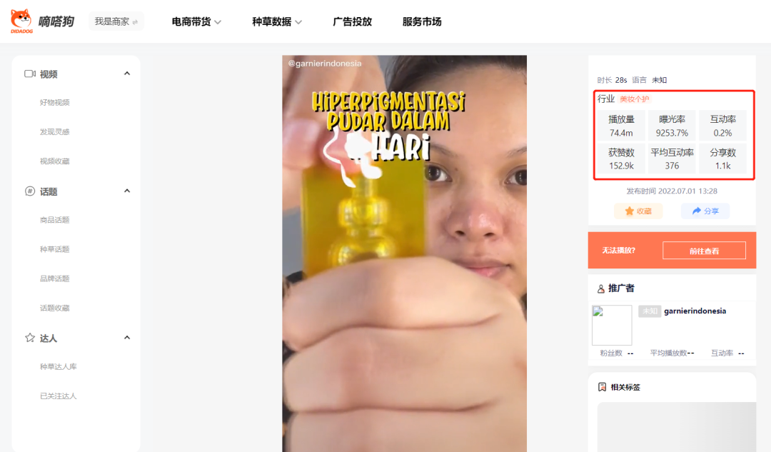 卡尼尔印尼的标签#garnierindonesia获得近2亿播放,不管是合作达人还是普通消费者,都会在标签内分享自己使用该品牌产品的感受,关于安瓶精华的标签#dontfakeitjustfixit已经获得了5.8亿播放,大部分都是分享安瓶精华使用前后的对比。