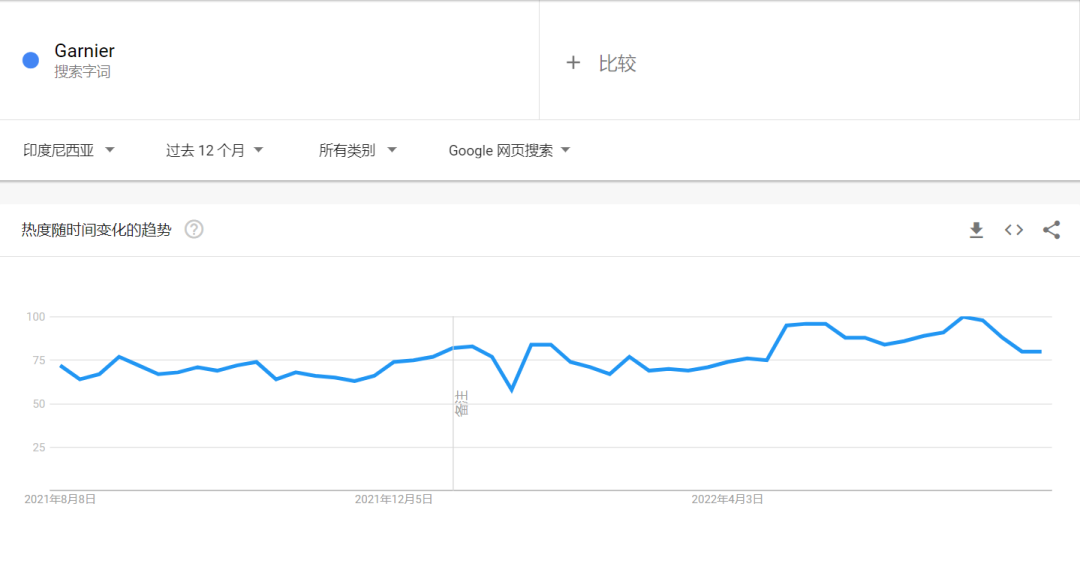 从上方搜索趋势中不难看出,当前印尼地区关于“garnier”的搜索在2022年明显上升,早在2021年对于“garnier”的搜索也超过了50,并且一年内,搜索量正在稳步上升。