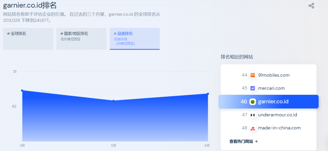 根据similarweb的数据发现,目前卡尼尔在最受欢迎印尼在线市场排名中为46名。