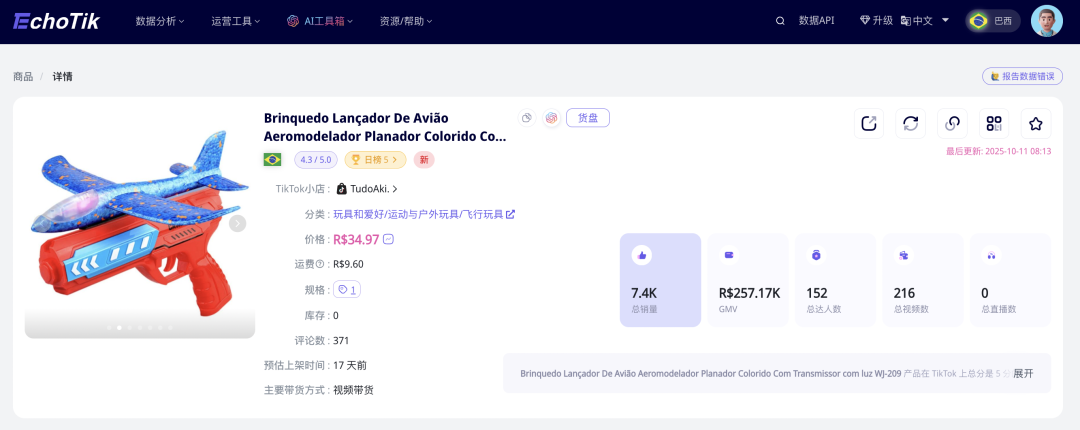据Echotik数据显示,这款爆品来自于巴西TikTok一家名为Chic&ShineBR(chic.shine8)的本土店,主要靠短视频和达人带货,目前共计建联达人480多人。全店销量,2个月将近4万件,主营玩具。