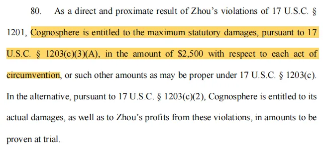 还要付DMCA 法定最高赔偿金(每项规避行为最高$2500),两项加起来要赔上百万人民币