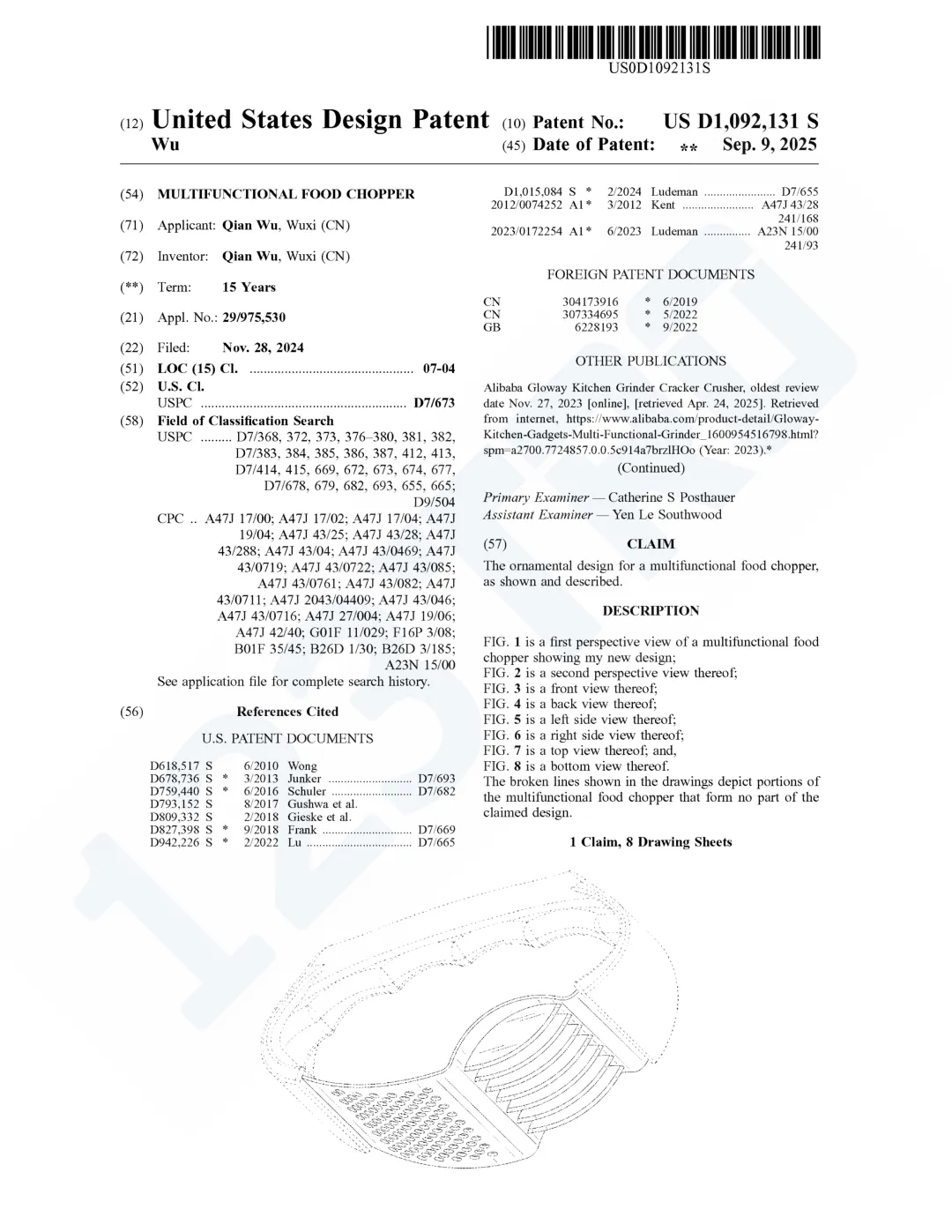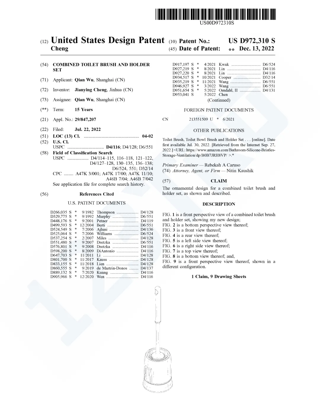 原告尚未公开具体的维权专利,小编发现其名下一共有3条外观专利,分别是马桶刷、蔬菜切割器,有卖这三款产品的朋友要多留意店铺情况
