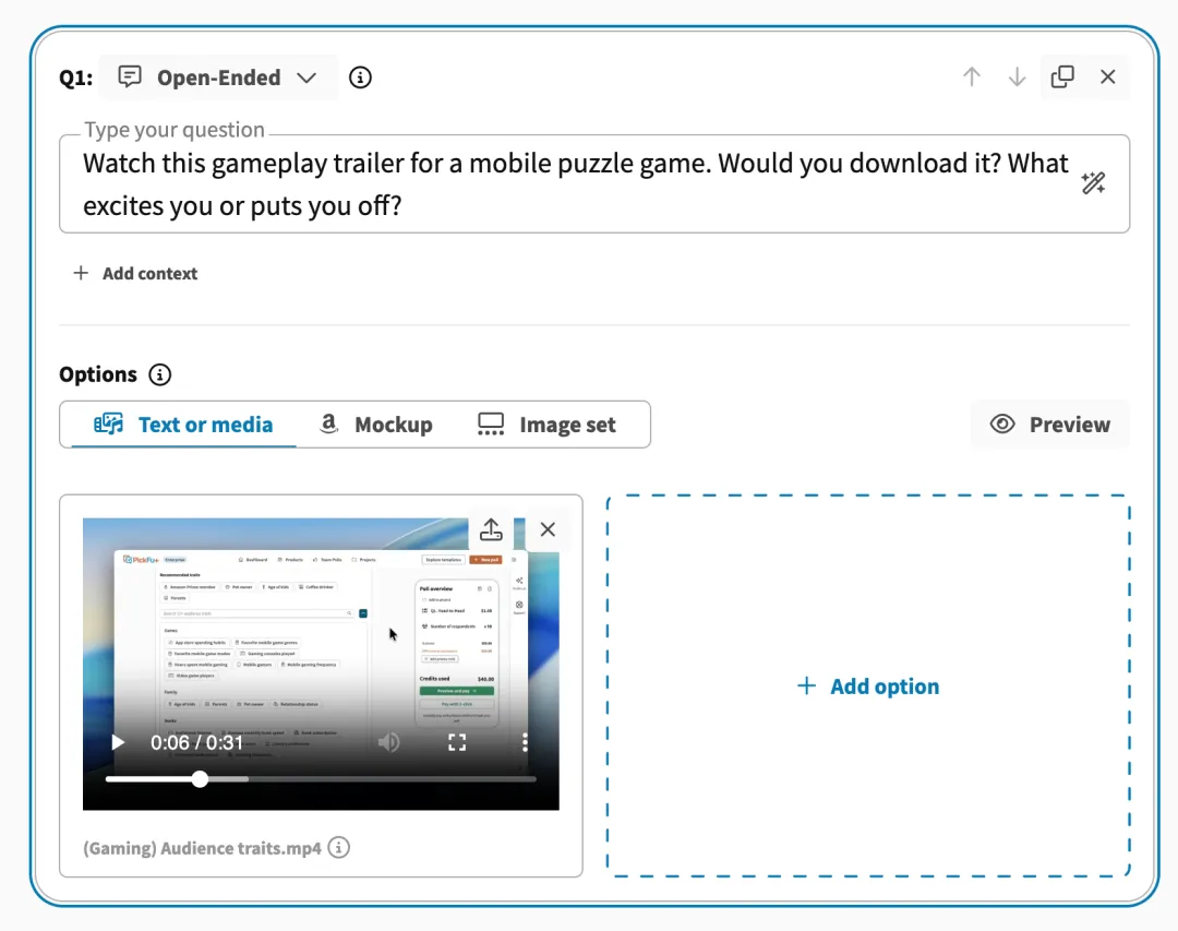 应用商店视频预览会自动播放,并且对转化越来越重要,尤其是在 Google Play。用这份投票测试 2–4 个视频缩略图版本或短玩法片段,找出最能驱动“想观看”意愿的方案,再决定是否投入完整视频制作。