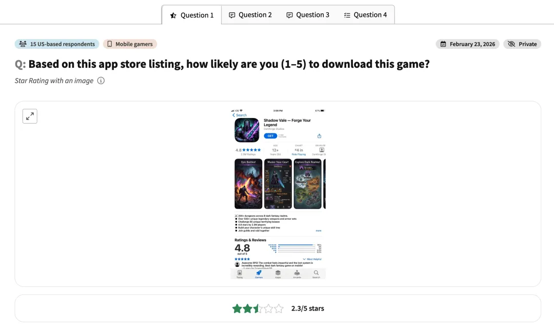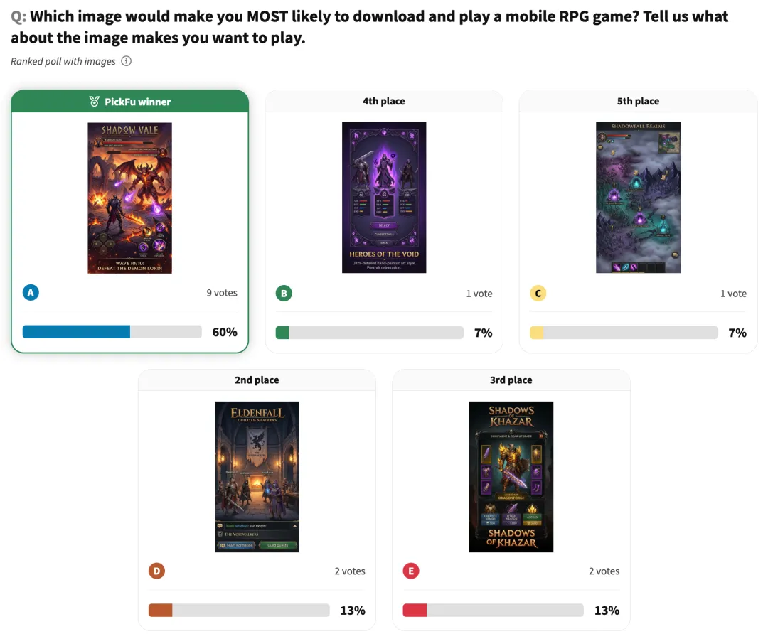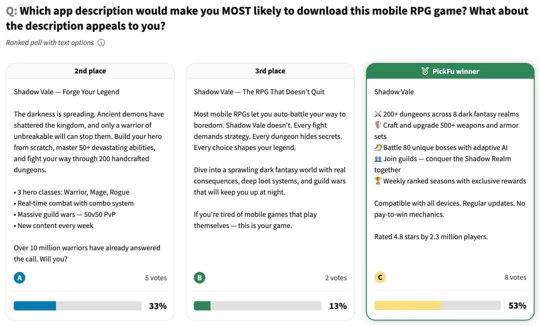 创建一个新的 Ranked(排名式问卷)投票,例如:https://app.pickfu.com/ask/XEFy66Ox90/survey?ref=workflow_aso-gaming