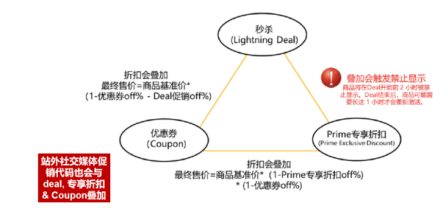 您参考以下折扣叠加的逻辑,建议同一 ASIN 在同一时间只使用一种促销工具,避免因为折扣叠加造成超高折扣从而影响利润。