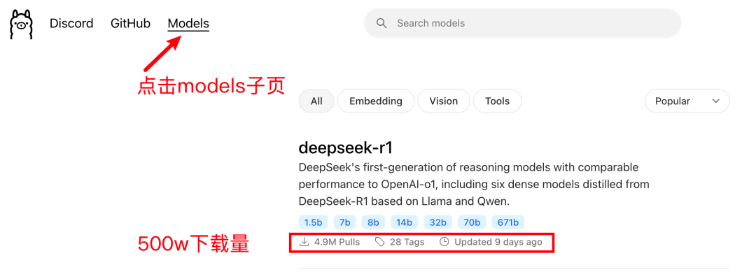 Ollama已经聚合了一些热门的开源模型,我们直接找到DeepSeek-r1模型