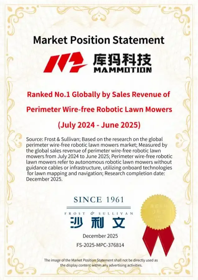 2025 年 1 月 6 日,库犸科技对外公布了一份来自沙利文的市场报告:在2024 年 7 月至 2025 年 6 月 期间,库犸位居全球无边界割草机器人销售额第一。
