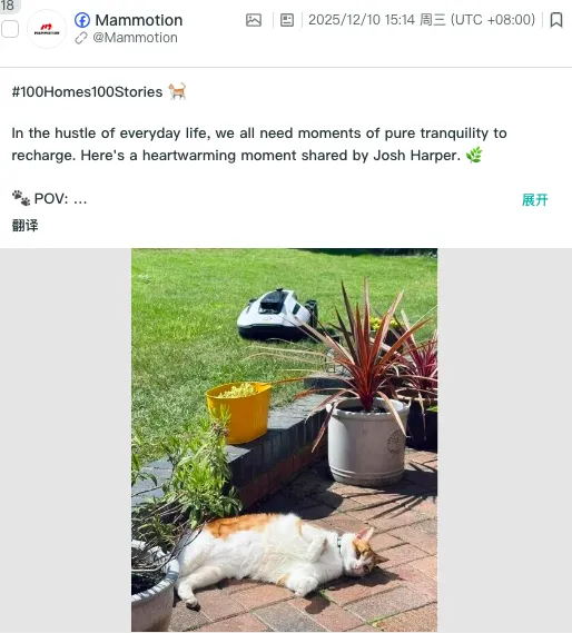 库犸在大量视频中,将割草机器人与猫、狗等宠物自然地放在同一画面里:机器人在庭院中行进、转向、避让,宠物在一旁自由活动,彼此互不干扰。