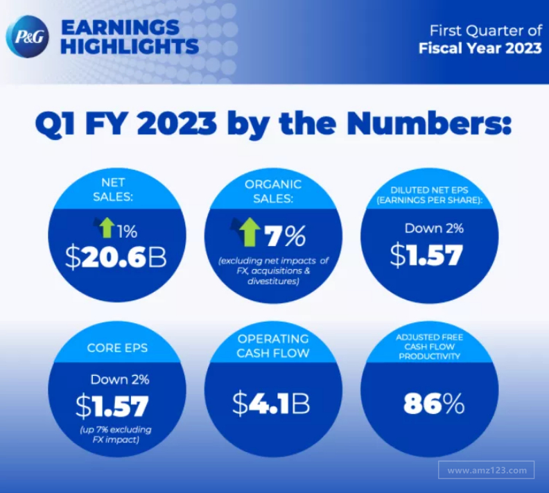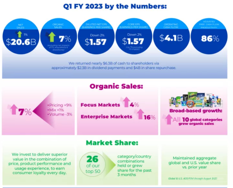 品牌方舟获悉,近日宝洁(P&G)公布23 财年第一季度财报,盈利与收入均超出预期,以下是业绩概要: