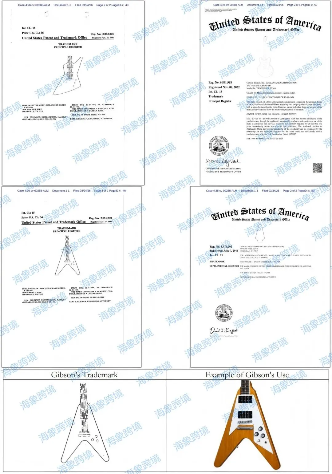 原告 Gibson, Inc 致力于从事乐器的开发、制造和销售业务,其知名产品包括电吉他、原声吉他及其他弦乐器。以下多个琴头设计商标注册在第15乐器类目,售卖类似琴体形状设计均有侵权风险, 未经允许不得使用!