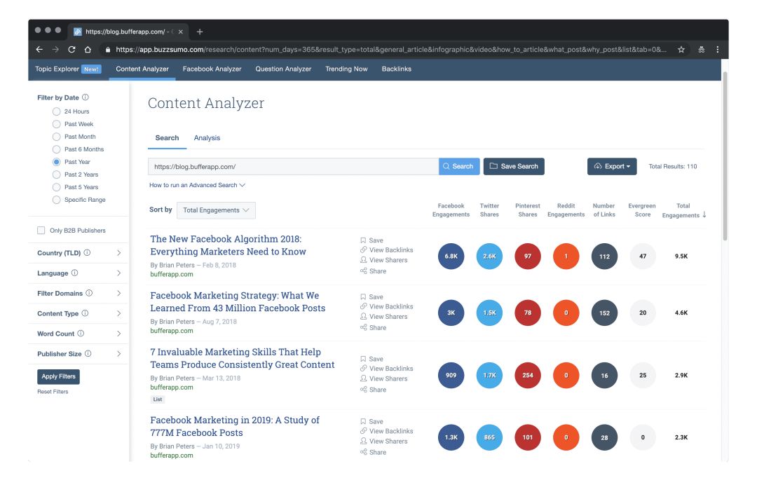 BuzzSumo可以帮品牌找到最值得分享的内容和最具人气的网红。品牌可以用它来分析不同主题中表现最佳的内容。通过BuzzSumo,人们可以对自己品牌在社交媒体上的影响力有大概的了解,并且可以据此来制定下一步的内容营销策略。而且BuzzSumo可以将分析结果细化到Facebook、Twitter、Pinterest和Reddit等不同的社交媒体。总而言之,品牌商只需通过BuzzSumo一个软件就能了解自己的品牌在不同社媒平台上的表现。