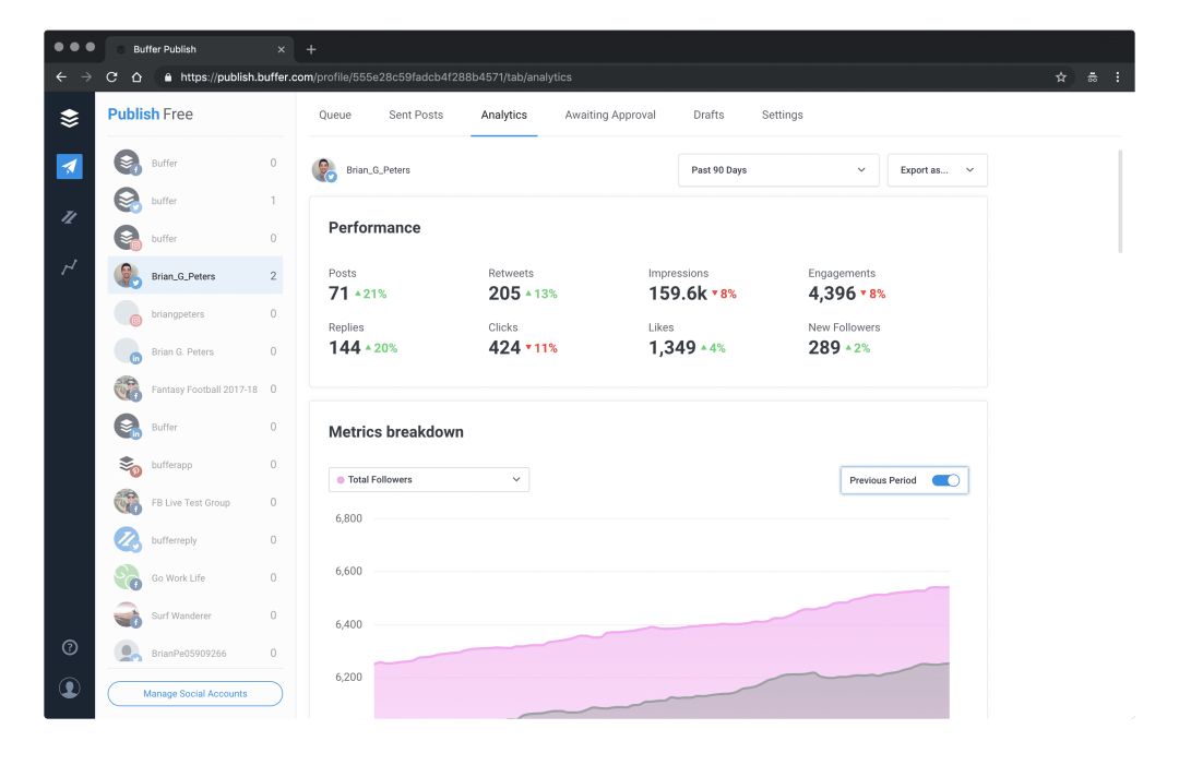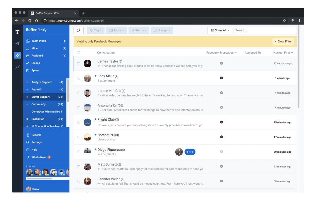 Buffer Reply可以有效提高社交媒体的用户参与度,并提高团队和用户之间的交流效率。通过一个平台,品牌商就可以看到不同平台上的数据分析,如Twitter的推送阅读量和回复率、Facebook的评论和转帖以及ins上的评论数。