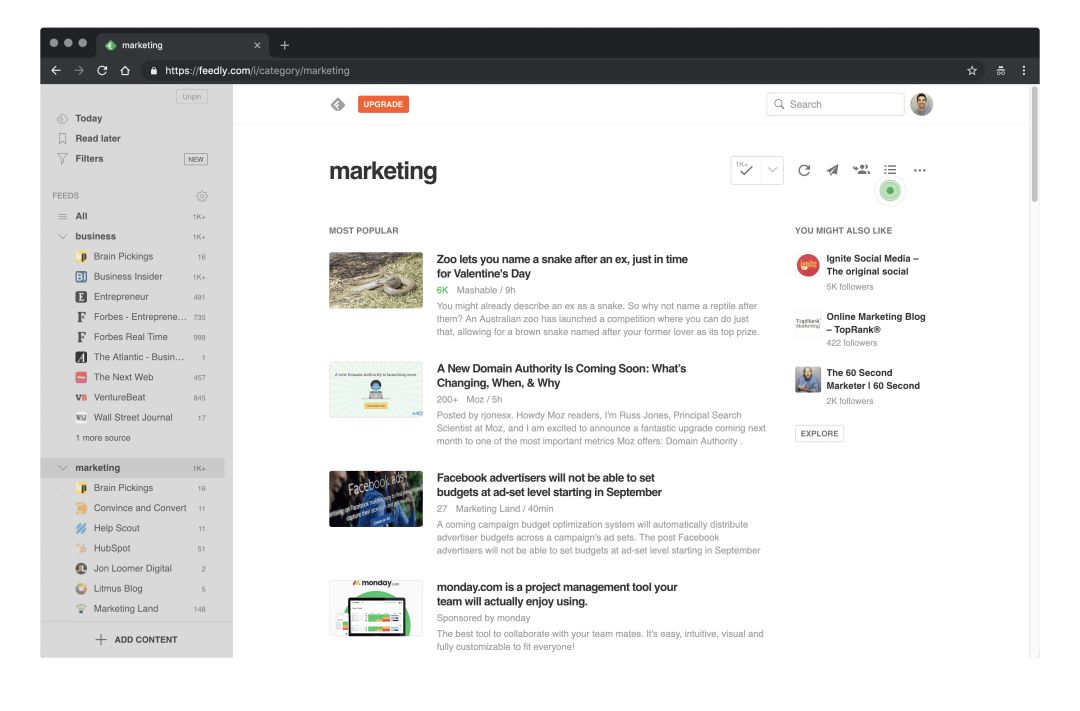 Feedly可以对于内容创作带来灵感。在这里,营销人员可以根据自己的需求关注不同的博主、网红和文字创造者。而且,它和Buffer一样,营销人员可以通过它定期在不同平台上发布内容。