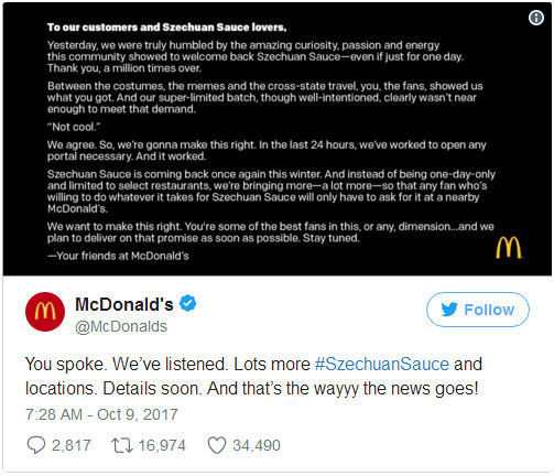 据《纽约时报》和Twitter上的报道称,麦当劳对动画片粉丝的强烈需求毫无准备。麦当劳只为数间商店提供了少于100包的四川辣酱,这导致了数百名甚至数千名顾客的愤怒。就这样,这场围绕“辣酱的战斗”爆发了。