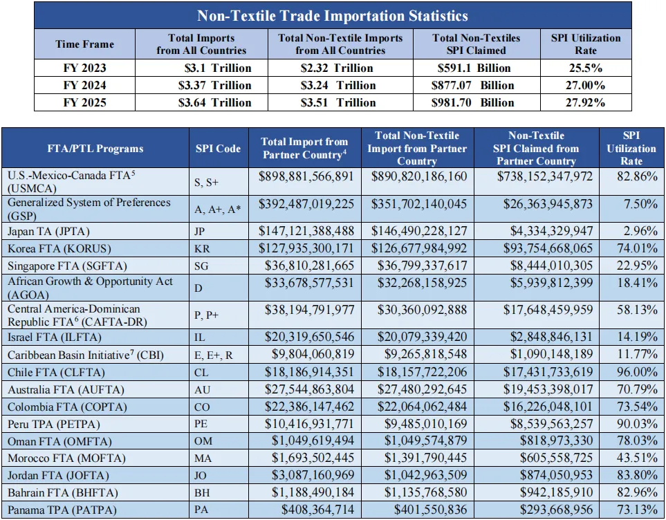 2025 财年美国非纺织品商品进口 FTAs 和 PTLs 关税优惠利用率情况报告