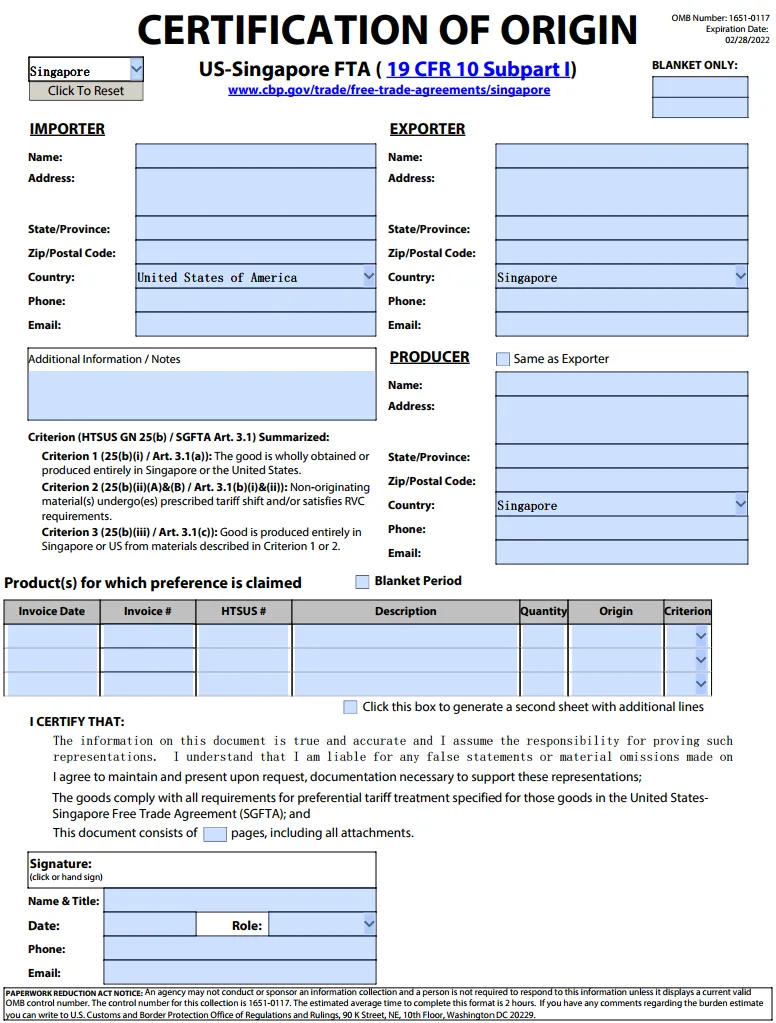 该模板可配置为多种不同贸易协定的原产地证书,用户可以选择使用,使用该模板或遵循其格式并非强制性要求。然而,根据相关法规(Regulations),在申请优惠关税待遇(Claim for preferential tariff treatment)时,仍需应 CBP 的要求提供模板中规定的所有数据项(包括制造商信息,出口商信息,进口商信息,商品描述,原产国和 HTS 海关编码等)。若未提供相关信息,可能导致美国海关 CBP 无法就贸易优惠(Trade benefit)或关税减免(Reduction in tariff)做出决定。