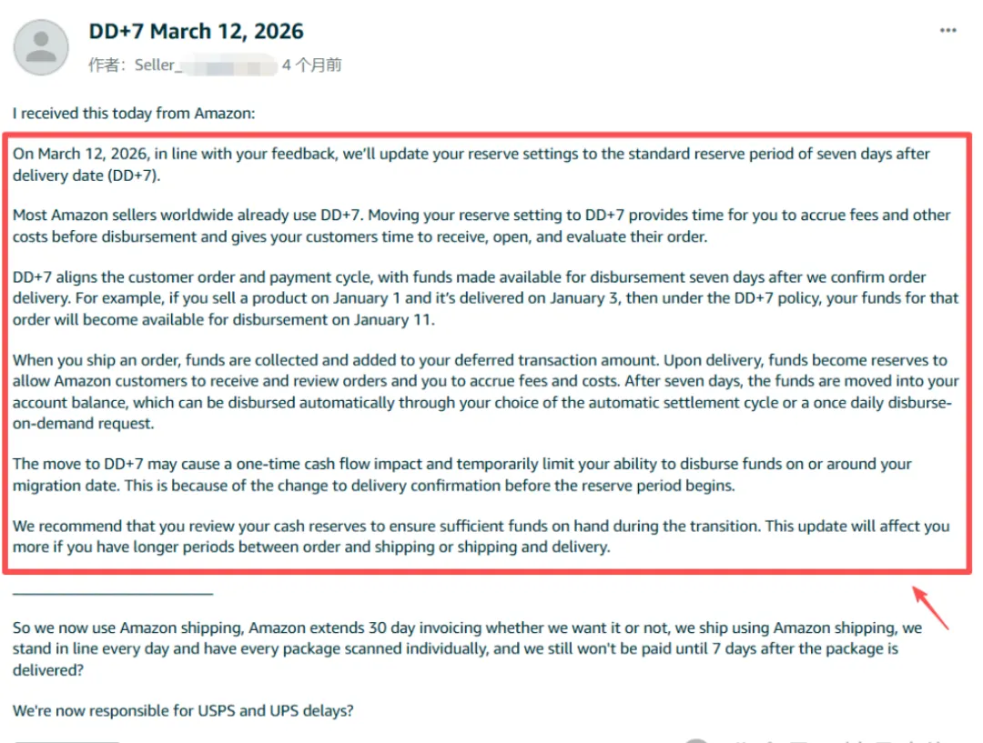 亚马逊将于2026年3月12日起正式全面推行“DD+7”资金预留政策,规定卖家在商品完成妥投后,相关货款将作为“储备金”由平台额外留存7个自然日,之后方可转入卖家可提取余额。此举将进一步延长跨境卖家的回款周期。以当日完成销售、3日内完成妥投的订单为例,资金到账周期将延长至10日;若叠加物流延误等不可控因素,部分站点的回款周期或将拉长至20-30天。