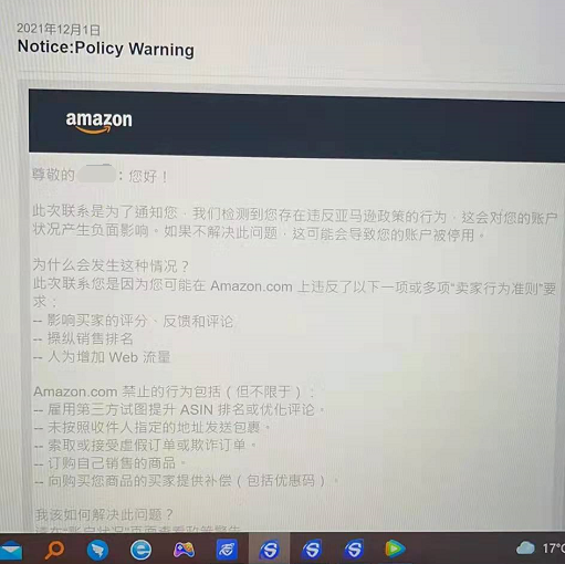 亚马逊抓刷单的行为一直没有停过,一旦被亚马逊监测到,正常会收到一封警告邮件,如下图,这也是所谓的一刷警告。