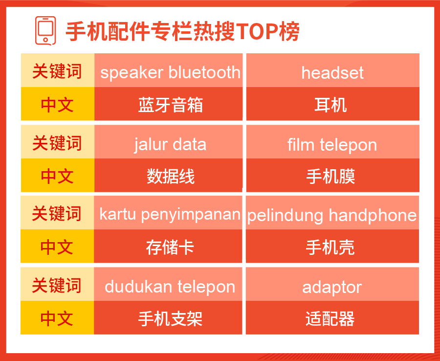 手机配件在Shopee各大站点的搜索量常年居高不下。手机壳、耳机、手机支架等配件是众多消费者都在寻找购买的。看到这片广阔的“金钱海洋”,选择乘风破浪的卖家也不在少数。那如何在印尼站点中脱颖而出呢?眼下,印尼市场消费者的关注重点主要是这类商品的价格:手机壳的价格区间建议选在Rp 23,000至40,000,数据线则为Rp 1,700至3,200。