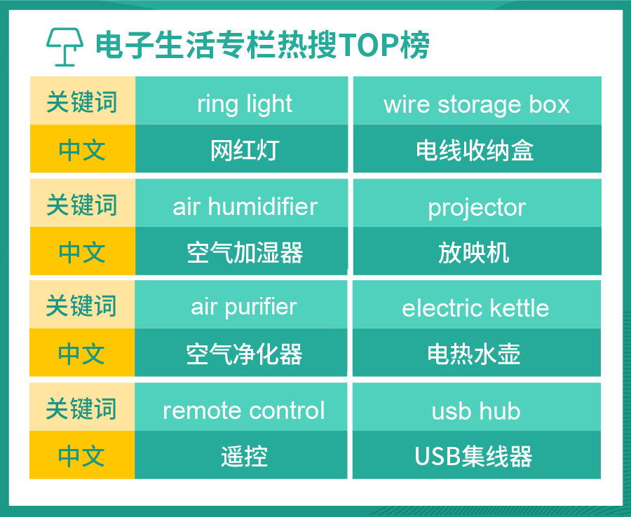 从这两个月以来的热搜关键词可以看出,菲律宾消费者对提升生活质量的电子产品偏爱有加,如空气加湿器、空气净化器、放映机等;同时他们对便利生活的产品也很重视,如网红自拍灯、电线收纳盒、USB集线器等,建议上新此类商品,附上生活、美好、健康等关键词,单量更有保证!