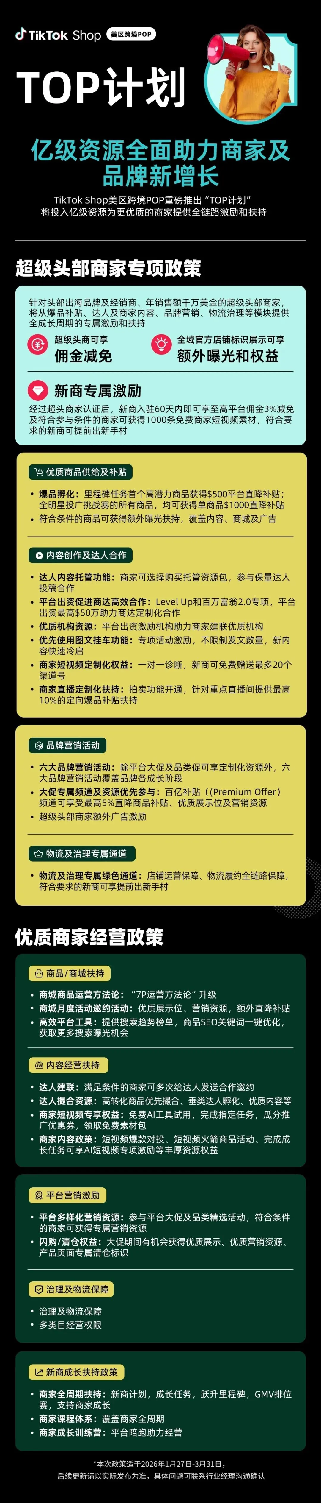 对深耕北美的品牌商家来说,开年便迎来利好消息。1月27日,TikTok Shop美区跨境POP针对头部出海品牌和经销商、以及年销售额达千万美金的“超级头部”商家召开私享会,现场发布“TOP计划”,平台将投入亿级资源,为优质商家提供全成长周期的激励扶持,并为“超级头部”商家提供更多专属资源和权益。