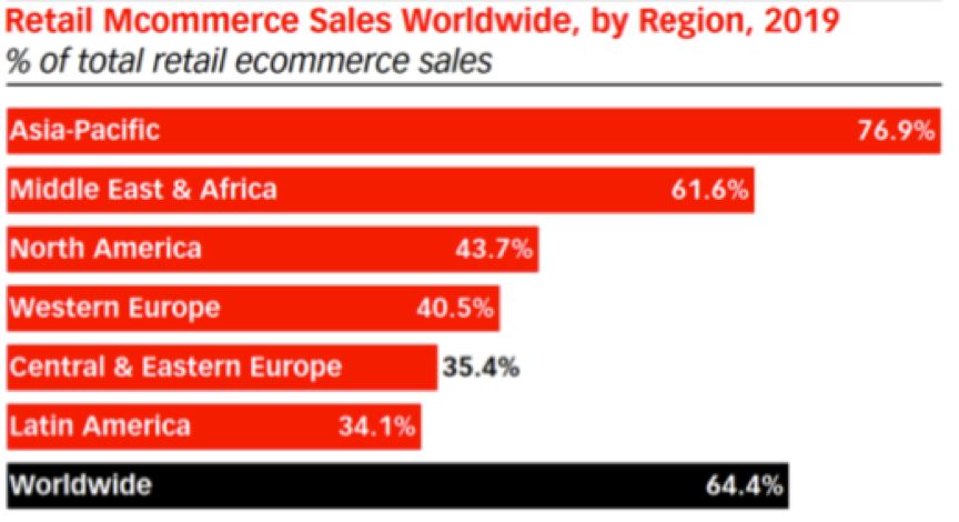 另一方面,世界上移动设备占比最多的是亚太地区(76.9%)和中东/非洲地区(61.6%)。这两个地区在很大程度上直接越过了PC时代,当数亿人首次上网时,他们直接进入的是移动领域。因此,在大多数互联网行为中,这两个地区一直是移动端优先,尤其是移动商务。