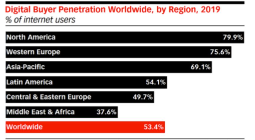 未来电子商务市场的增长在很大程度上取决于他们目前的市场成熟度和数字买家的渗透率。北美(79.9%)和西欧(75.6%)买家渗透率较高,而亚太地区也具有较高的渗透率(69.1%)。世界其他地区,如拉丁美洲(54.1%),中欧和东欧(49.7%)以及中东和非洲(37.6%)目前都处于发展阶段。