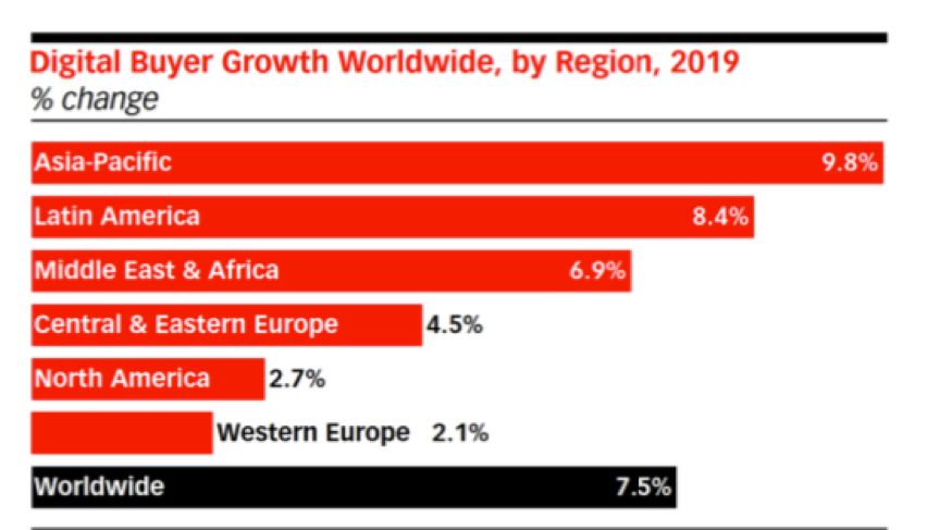 有趣的是,亚太地区将成为增长最快的数字买家市场,占9.8%。尽管已经具有较高的渗透率,但强劲的人口增长和对农村地区的互联网接入将继续推动这一趋势。亚太地区有望对未来的全球电子商务市场产生巨大影响。
