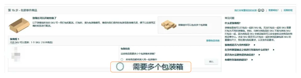 系统会把能一起打包的SKU分成一组,比如危险品和非危险品不能混装。你要选"都装一箱"还是"需要多箱"。