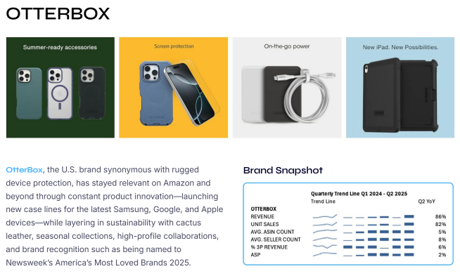 OtterBox 作为美国 rugged 设备防护领域的代表性品牌,在亚马逊平台始终保持着强大的竞争力与影响力。它不仅持续推出适配三星、谷歌、苹果等最新设备的保护类产品,还融入可持续发展理念,采用仙人掌皮革材质,同时结合季节性系列、高知名度合作等方式,不断强化品牌认知,甚至被《新闻周刊》评为 2025 年 “美国最受喜爱品牌”。