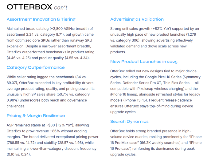 OtterBox 证明了平衡的产品组合与广告驱动的需求测试,能够在保持价格integrity 的同时,推动大幅增长。尽管卖家评分稍弱且高度依赖第三方渠道,但凭借强大的产品质量、定价韧性和创新节奏,它在增长与盈利关键指标上超越了品类基准。对于亚马逊卖家而言,可借鉴其聚焦核心产品优化、结合广告验证需求、把控定价与产品质量的策略,在竞争中寻求突破与增长。