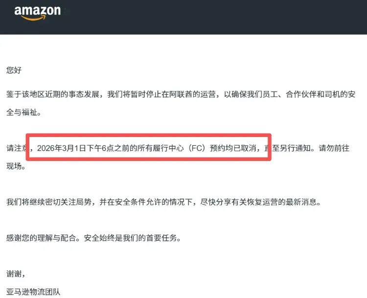 3月1日,亚马逊宣布暂时停止在阿联酋的运营,核心目的是保障员工、合作伙伴及配送司机的安全。通知明确,3月1日下午6点前,阿联酋所有履行中心的预约均已取消。目前,FBA和自发货订单处于停滞状态,配送服务全面暂停,恢复时间取决于局势降温速度。