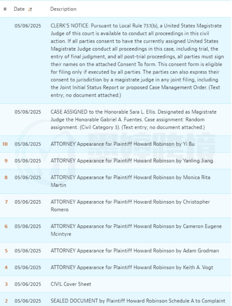 本案于2025年5月6日发起侵权诉讼,案件号:25-cv-04956,原告尚未提起TRO禁令(Temporary Restraining Order,临时限制令)的动议。