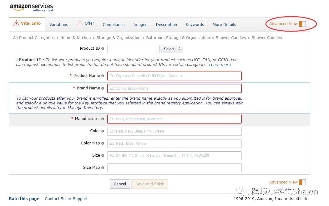 注意,进入上传页面后,一定要将Advanced View功能点开,这样可以写更多的产品描述,这对亚马逊第一时间辨别产品属性很有帮助。