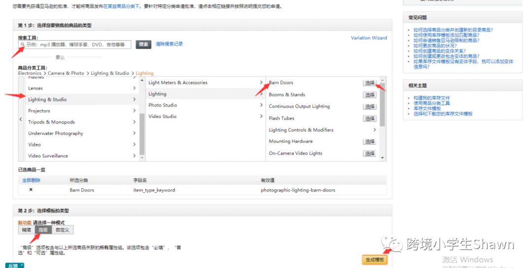 (2)选择目标产品的最小子类目,这时会出来一个有效值,选择模版的类型为高级生成模版, 批量模版下载完成后就可以上传商品了(PS:有些类目没有批量模版)