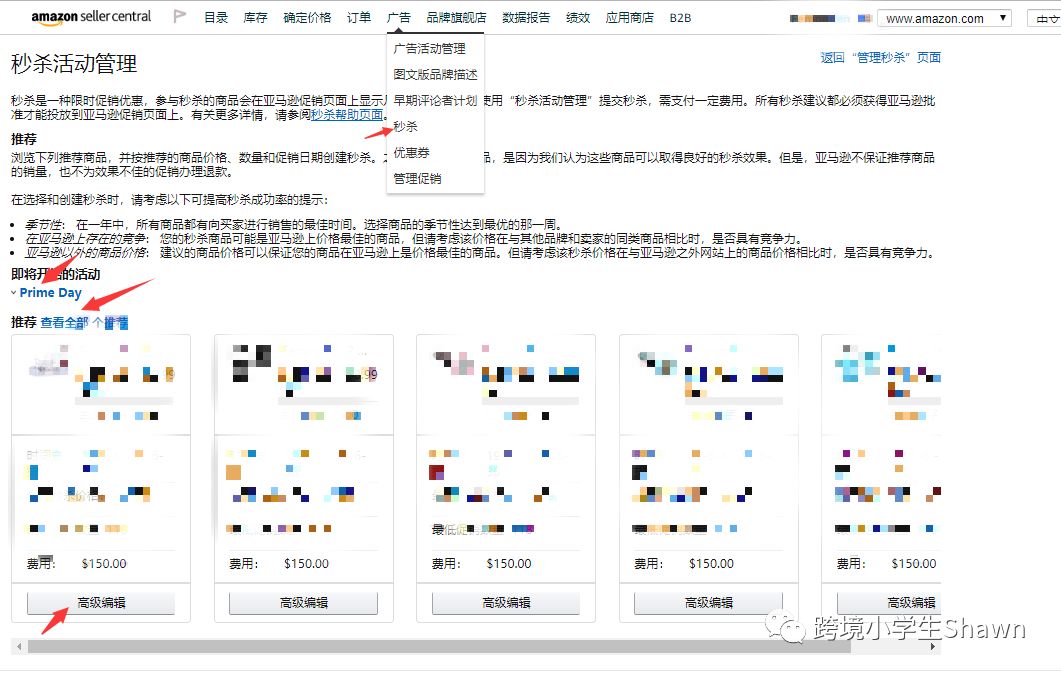 秒杀是一种限时促销优惠,参与秒杀的商品会在亚马逊促销页面上显示几个小时。使用“秒杀活动管理”提交秒杀,需支付一定费用。所有秒杀都必须获得亚马逊批准才能投放到促销页面上。优点:能让产品短时间内排名蹿升,订单增加;缺点:需要支付亚马逊一定的费用,效果无法预知