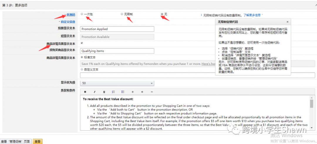 坑:(1)扣码设置错误 (2)优惠码设置错误 (3)商品详情页面显示文本是否勾选